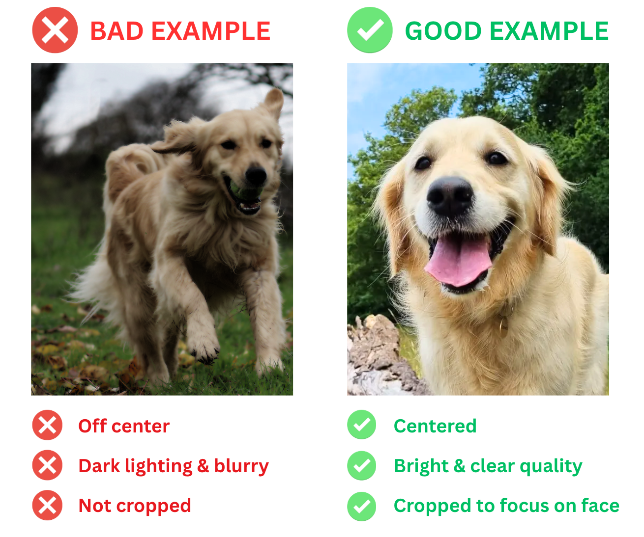 Please upload a high-quality, well-lit photo of your pet. For the best results, avoid full-body shots. Images that are cropped to highlight your pet’s face and upper body (torso) tend to work best.